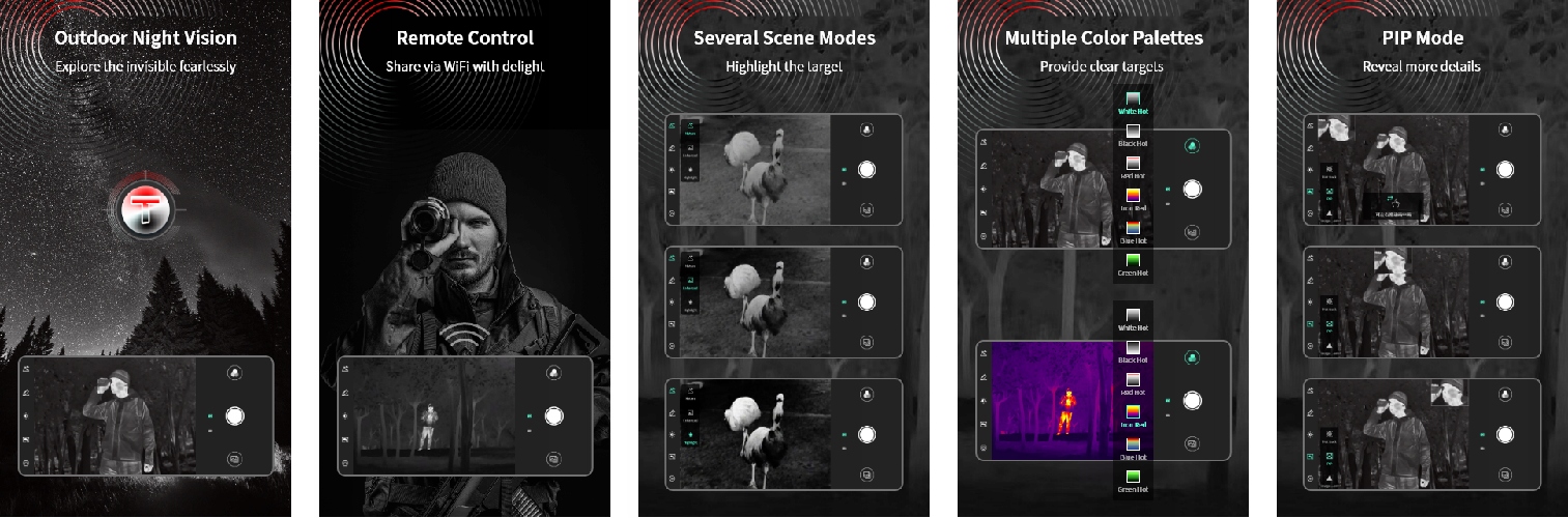 - 6 цветовых палитр на выбор: Hot Hot, Black Hot, Iron Red, Blue Hot, Green Hot и Регулируемый Red Hot.