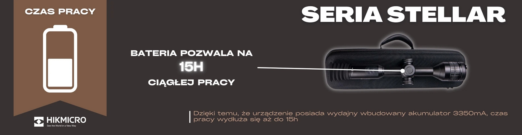 < Тепловизионный прицел Camera Stellar SH35 Hikmicro обеспечивает 15 часов работы. Благодаря тому, что он имеет эффективный встроенный аккумулятор емкостью 3350 мА. Дополнительно имеется дополнительное место для батарейки CR123A, что значительно увеличивает время работы до 15 часов, что является лучшим результатом среди тепловизионных прицелов.Кроме того, мы можем подключить наш телескоп к внешнему источник питания в виде павербанка с использованием кабеля USB-C.