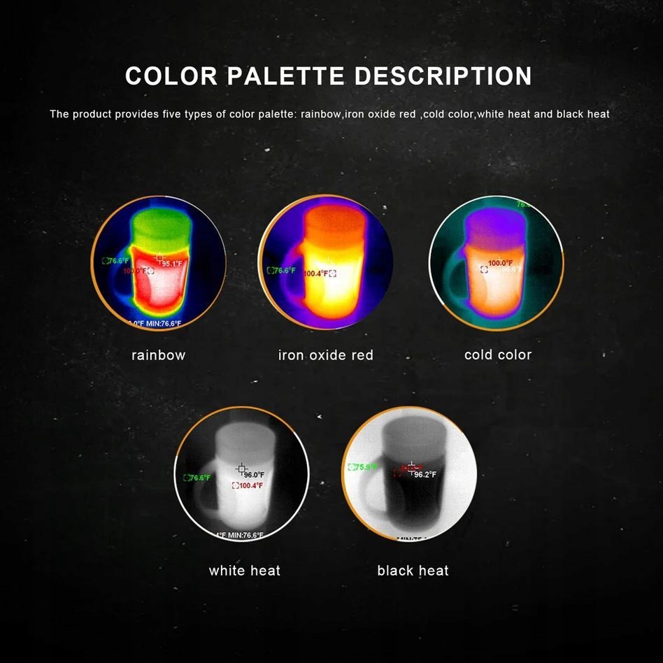 Коэффициент излучения можно регулировать для повышения точности измерения объектов с вдвое меньшей отражающей способностью. область. Курсор самой высокой и самой низкой температуры может направлять пользователя к областям с самой высокой и самой низкой температурой на тепловых изображениях. Цветовая палитра на выбор.
