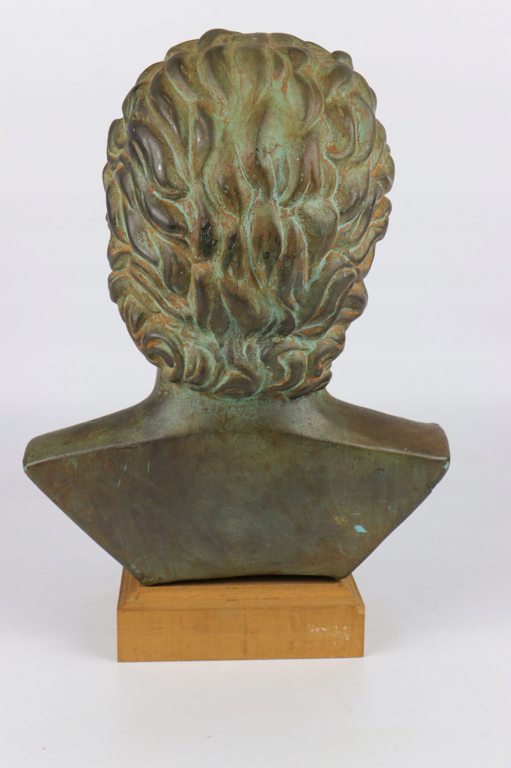 Интересный большой терракотовый бюст Александра Македонского, установленный на деревянном постаменте. Бюст имеет интересный коричнево-зеленоватый цвет. В основании находится мемориальная доска «Бюст Александра Музея Лувр»