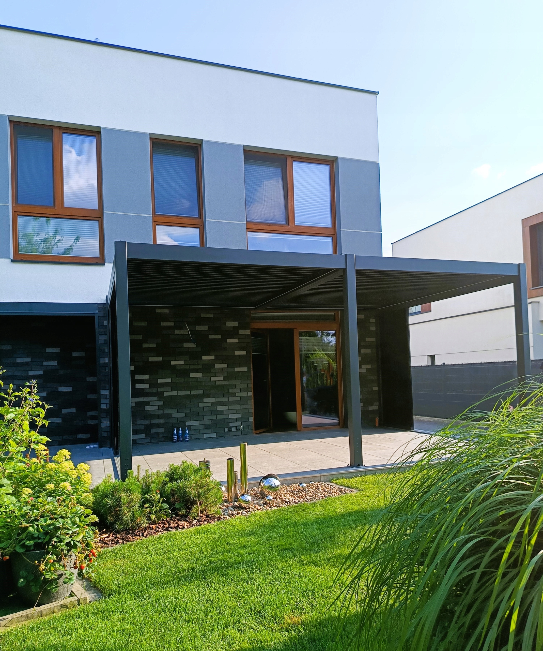 Optimo STIMEO Pergola - это современная пергола с электрически открытой крышей. С помощью пульта дистанционного управления с диапазоном до 40 м вы можете контролировать количество солнечного света, падающего или контролировать температуру под крышей. Он на 100% водонепроницаемый, а система сброса способна слить воду даже во время сильного шторма. в поляках.