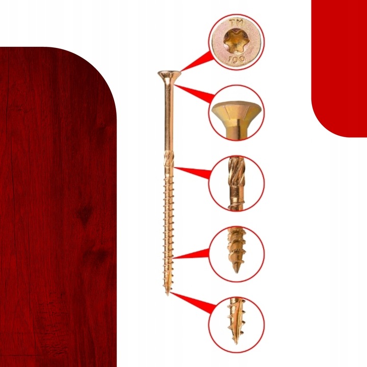 Torx Tugs Torx, специальное бурение с надписью с режущими адекватами, виноватая частота трения во время прикручивания, наклоняя струю в голову. Продукт, изготовленный в соответствии с европейскими стандартами: PN-EN 14592: 2008+A1: 2012, имеет сертификаты и разрешения.