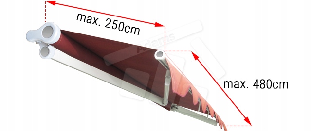 Тент изготавливается по индивидуальному заказу. Что касается ширины, то стандартных размеров не существует. Максимальная ширина 480 см, вылет 250 см.