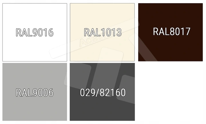 В стандартной комплектации мы можем без дополнительной оплаты выбрать 5 различных цветов конструкции по палитре RAL. В структуру входят, среди прочего: кронштейны, передняя балка, ручки, колпаки, механизм. Доступны следующие цвета: белый 9016, бежевый 1013, коричневый 8017, серебро 9006, антрацит.