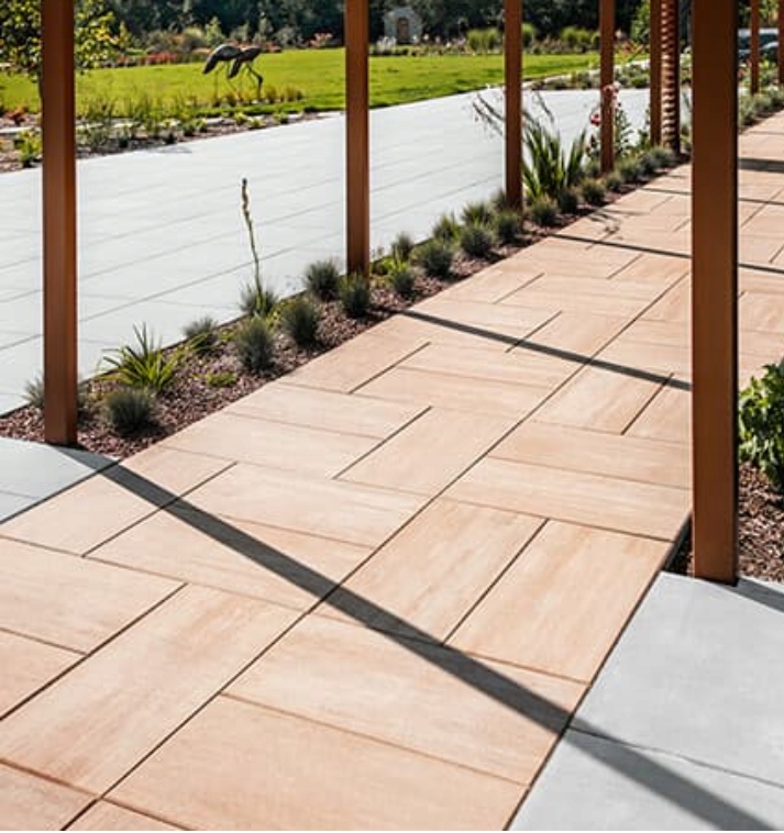 Libra colormix в цветах серого, графита и теплого коричневого, он эффективно работает в окружении дома, как путь в саду, поверхность террасы или садовый дворик.