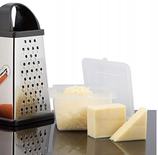 Тёрка четырёхсторонняя из нержавеющей стали и пластика. Оснащен четырьмя острыми поверхностями для натирания, терки и нарезки.