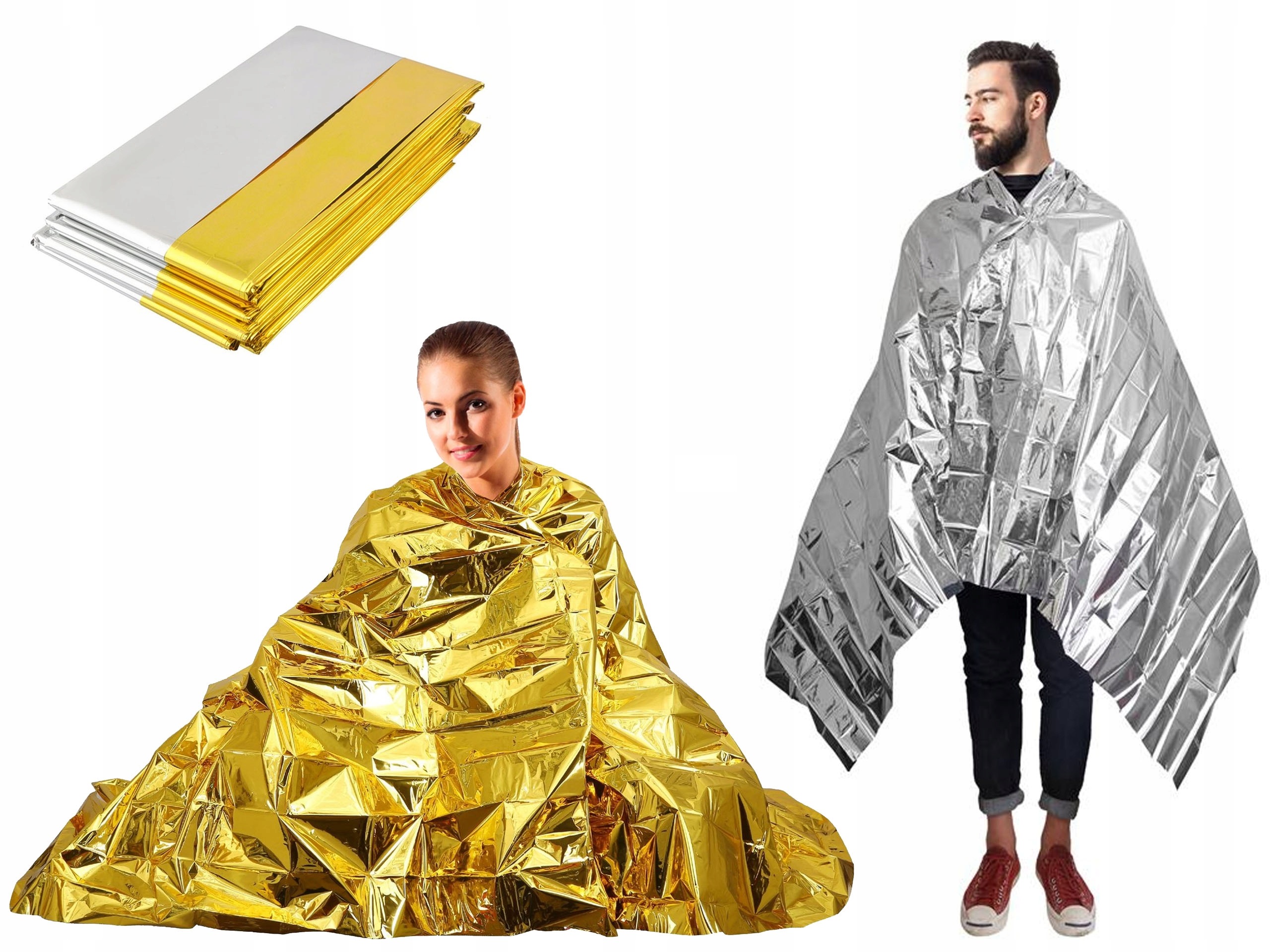 Теплоизоляционное спасательное одеяло используется в спасательных службах для защиты от переохлаждения. или перегрев тела. Серебристая внутренняя часть сохраняет тепло тела, а золотая внешняя часть отражает солнечный свет.