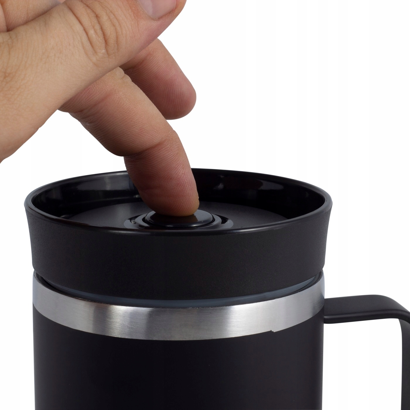 - Нажатая кнопка позволяет пить как обычная чашка. Выпуск кнопки плотно закрывает чашку, и она действует как термос.