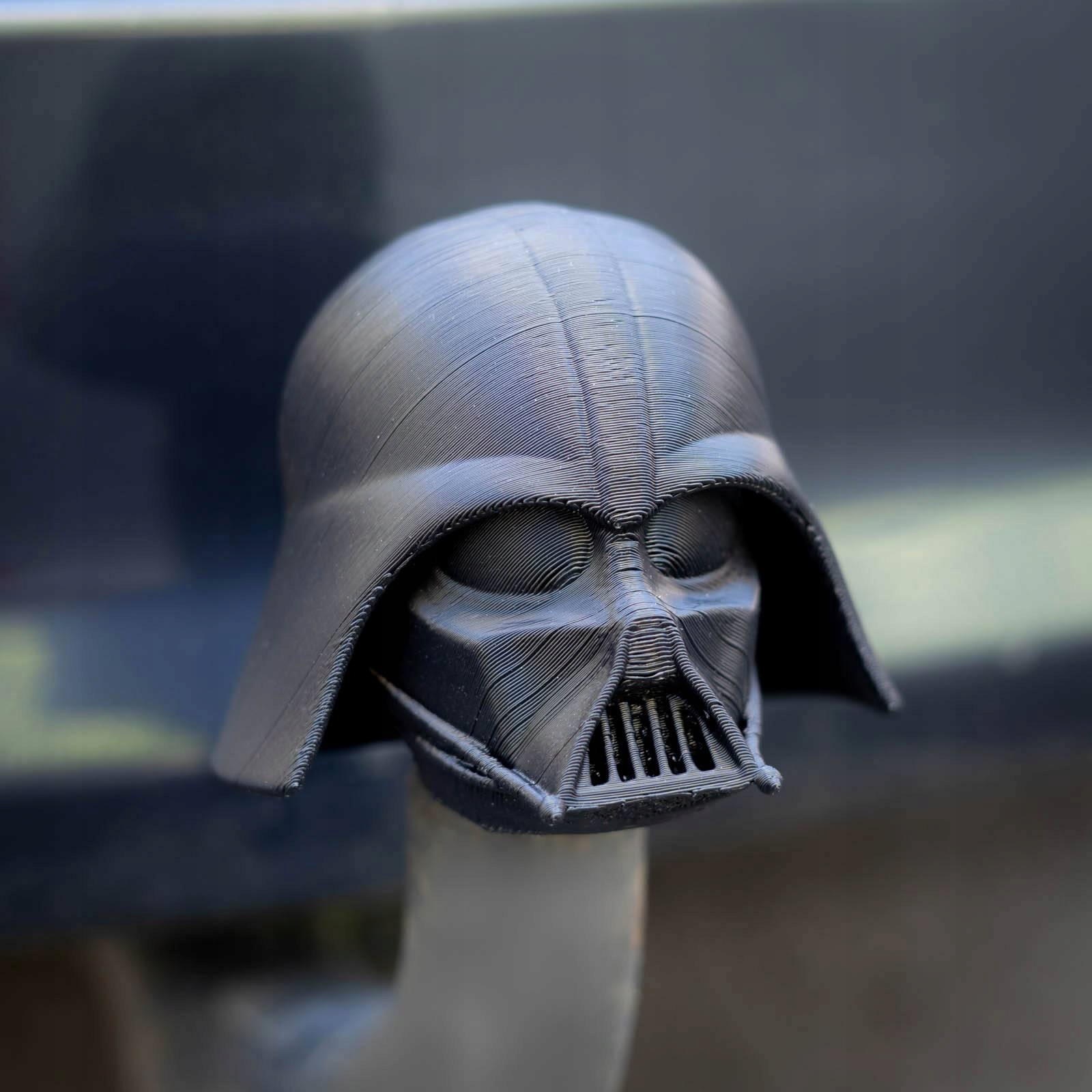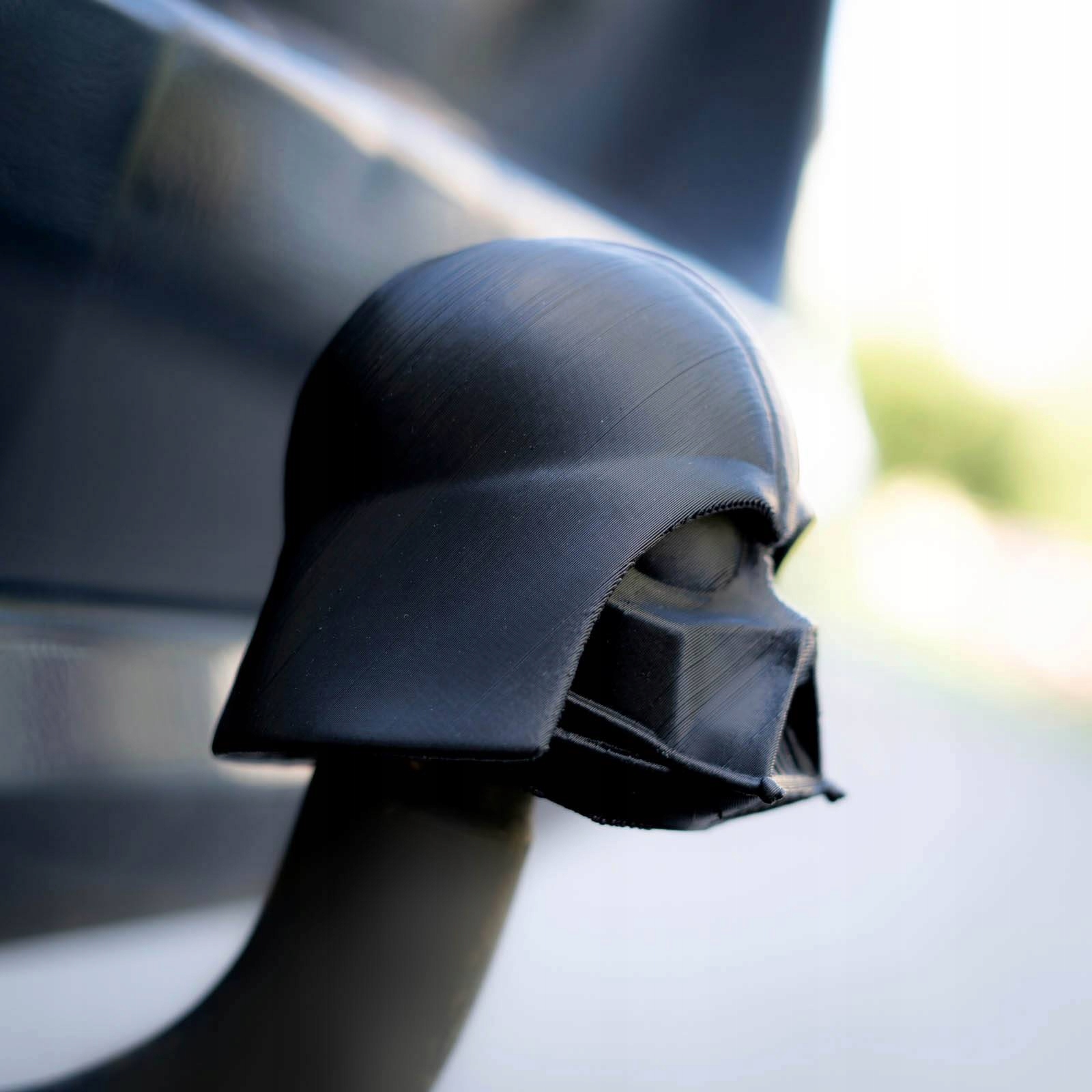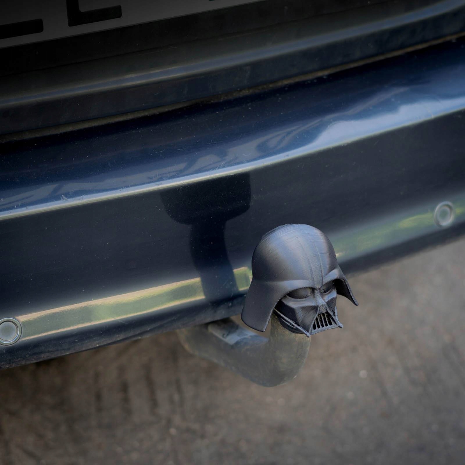 Что-то для фаната фильмов «Звездные войны». Напечатанный на 3D-принтере чехол на фаркоп для легкового автомобиля — черный шлем Дарта Вейдера.