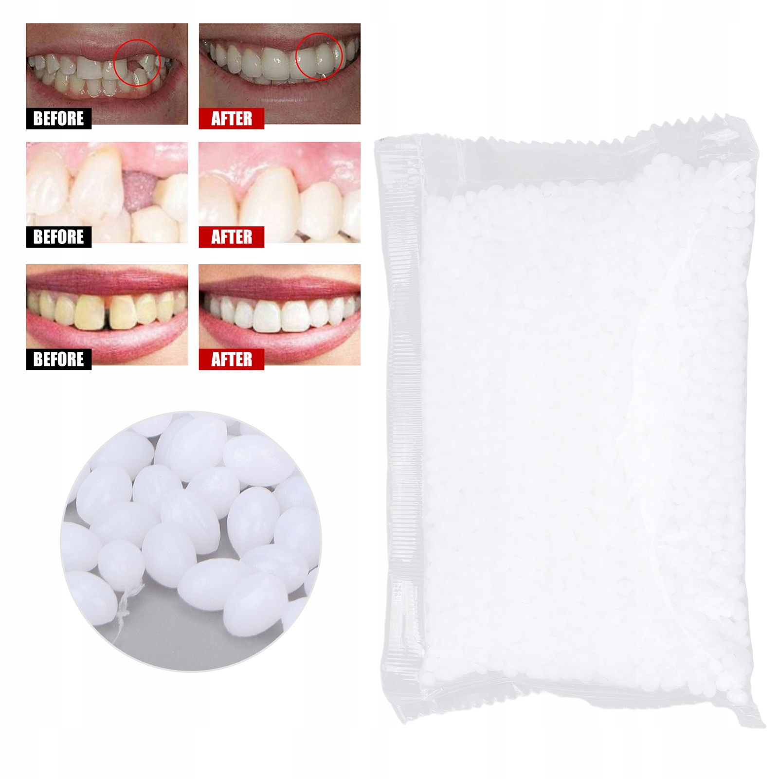4. Легко в использовании: положите бусин, который заполняет зубы в горячую воду при 80-100 ℃. После нагрева бусинки, заполняя зубы, его можно сформировать. Не забудьте контролировать температуру, чтобы легко получить желаемую форму.