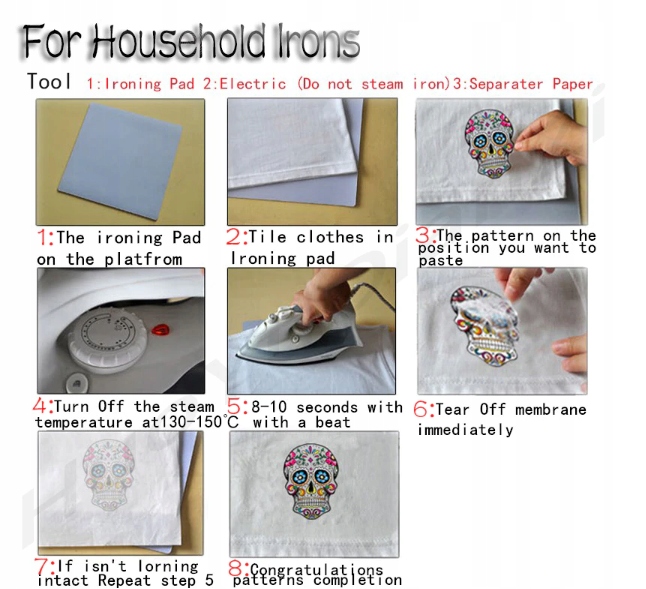 8. Прогладьте аппликацию, прикладывая только бумагу + утюг пониженной температуры (соответствует используемому материалу). .Действуйте, как показано на рисунке ниже.