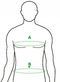 - A. Окружность груди – измерьте обхват груди под мышками, удерживая мерку на одной высоте.