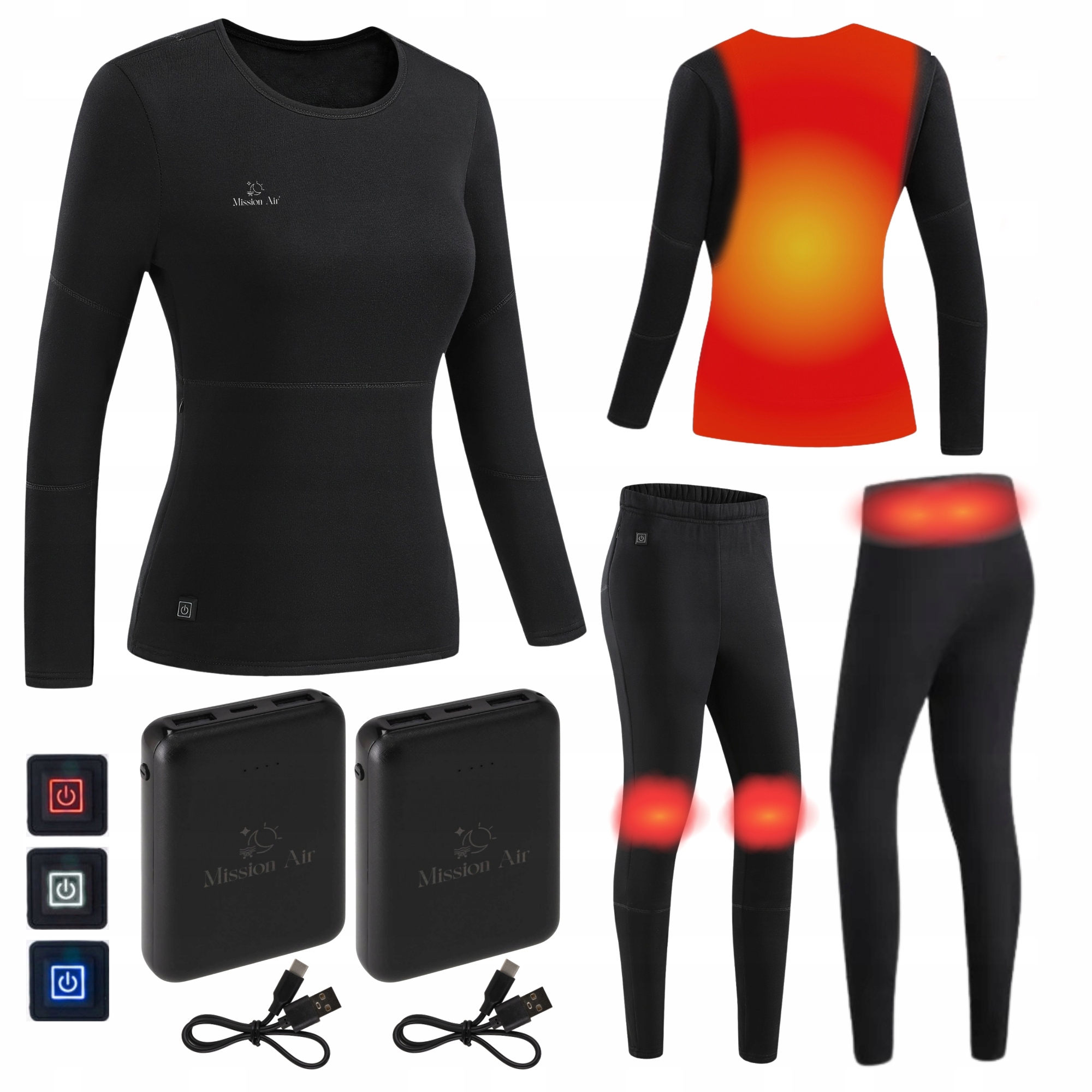 В блузке и в штанах вы найдете карманы для размещения Powerban. Кабель с USB -разъемом был выведен в каждом кармане. который поставляет элементы отопления. просто подключите банк Power, а затем включите его. Затем нажмите и удерживайте переключатель данной зоны отопления, расположенной на ремне или рядом с карманом штанов и ... готов! Вы можете наслаждаться приятным и удобным теплом в своей новой тепловой одежде от Mission Air!