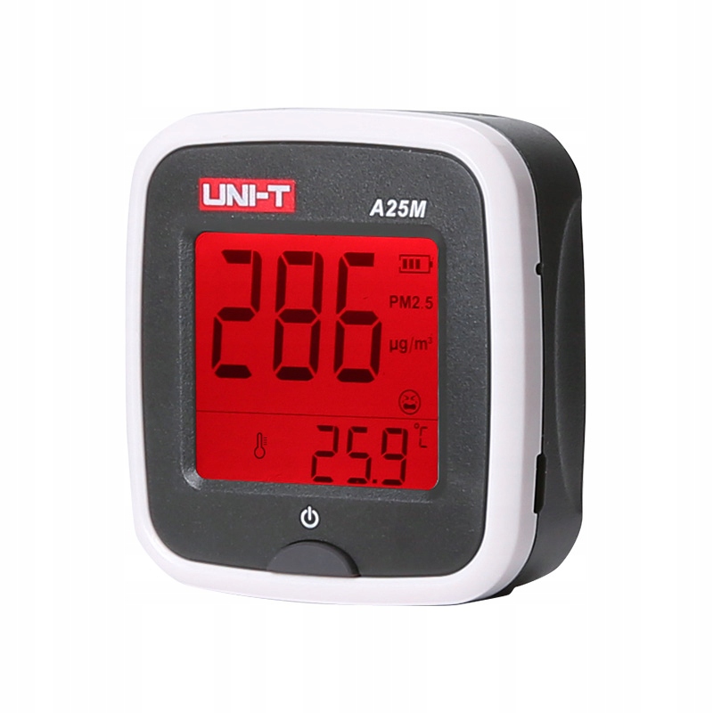 A25M — это портативный измеритель частиц PM2,5, который можно использовать в домах, офисах, транспортных средствах, лабораториях, офисах, гостиницах, школах, фабриках, конференц-залах, аэропортах, больницах, ресторанах, торговых центрах и многих других общественных местах. Он измеряет концентрацию частиц в микрограммах на кубический метр. На ЖК-дисплее с подсветкой отображается концентрация в мкг/м3, а также с помощью смайлов. Коротким нажатием кнопки питания можно включить или выключить белую подсветку дисплея. По умолчанию подсветка включается автоматически при включении устройства. Если концентрация частиц превышает норму (PM 2,5 > 115 мкг/м3), включается красная подсветка. При падении концентрации частиц ниже нормы (PM2,5 ≤ 115 мкг/м3) красная подсветка автоматически выключается (становится белой). Если концентрация частиц PM 2,5 > 115 мкг/м3 сохраняется в течение длительного времени, вы можете вручную отключить красную подсветку для экономии заряда батареи, кратковременно нажав кнопку питания. На дисплее также отображается приблизительное значение температуры. Устройство содержит полимерный аккумулятор емкостью 520 мАч, который можно заряжать с помощью прилагаемого USB-кабеля micro USB-B от источника 5 В/1 А.