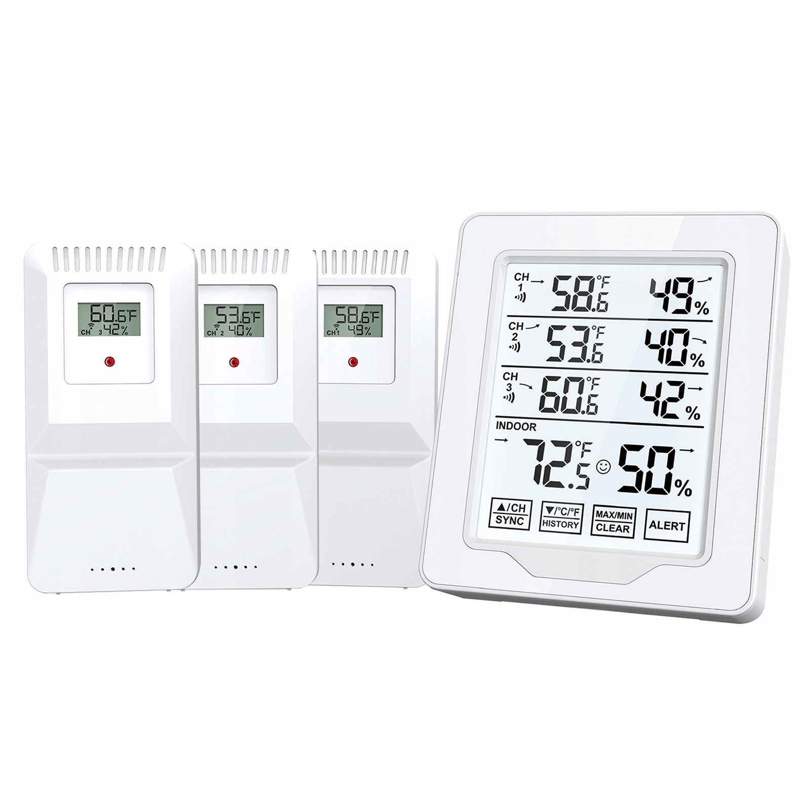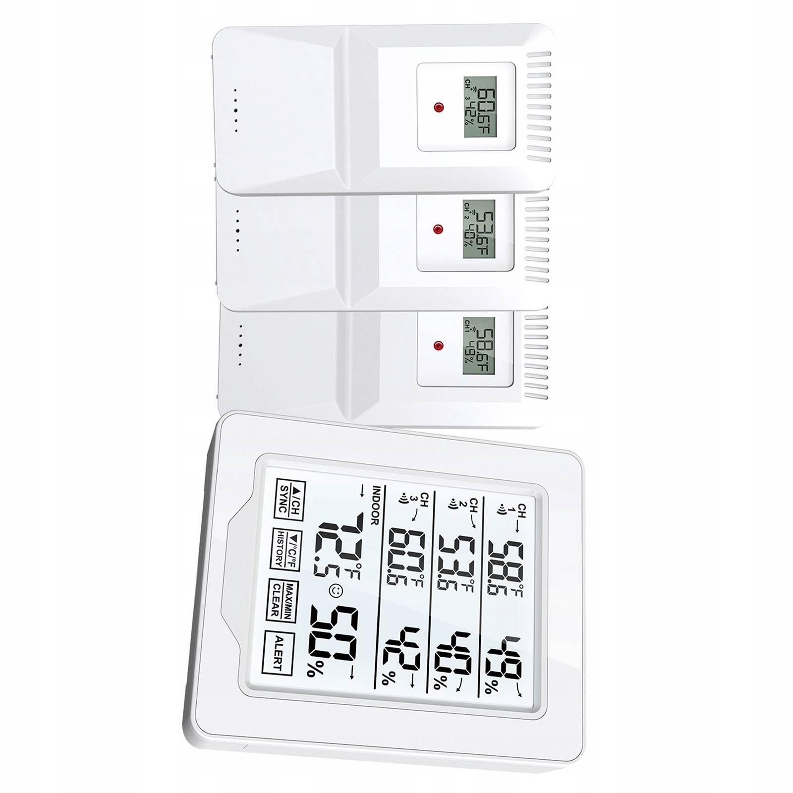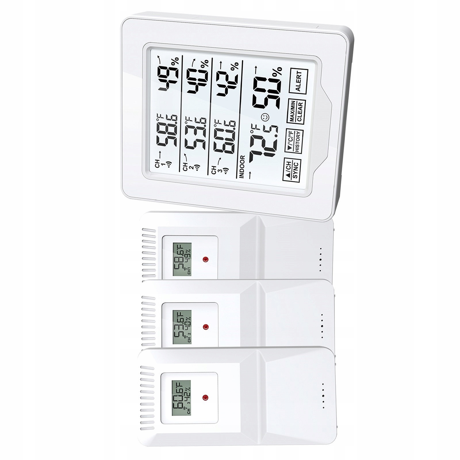 3 датчика: Цифровой термометр оснащен 3 датчиками, которые могут контролировать 4 разных места одновременно (3 датчика + интерьер). Удобен для контроля влажности и температуры в разных помещениях и местах.