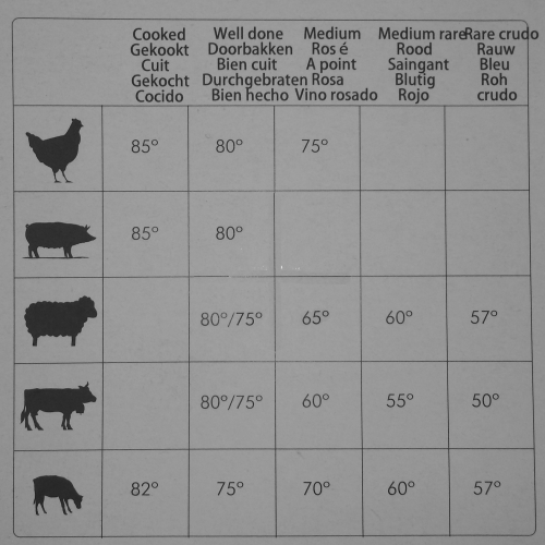 Некоторое удобство обеспечивает таблица, показывающая подходящую температуру для данного типа мяса.