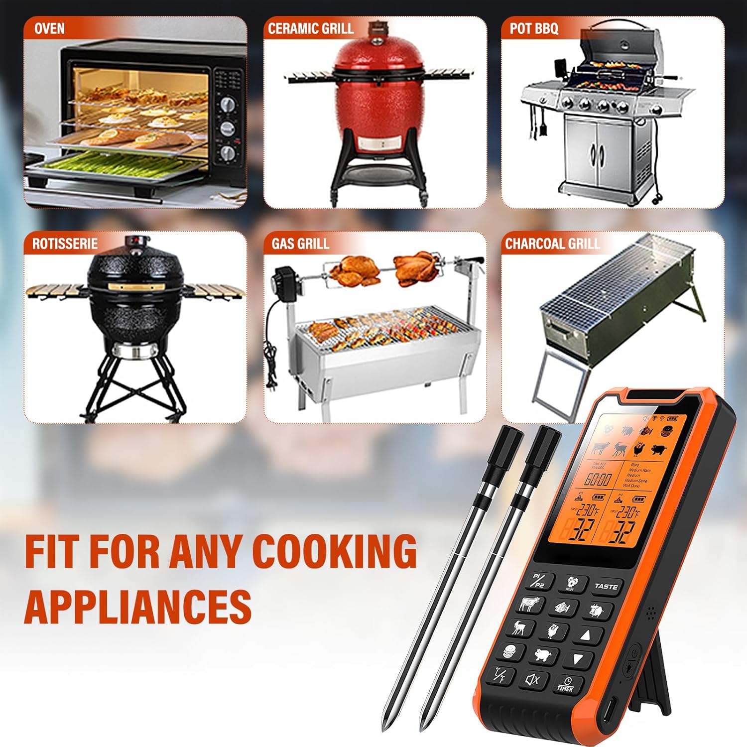 Беспроводной термометр с двумя датчиками для измерения температуры гриля, который одновременно контролирует внутреннюю температуру мяса (от -22°C до 100°C / от -71°F до 212°F). Изготовлен из пищевой нержавеющей стали 304, водостойкий IP67 и легко чистится. После введения зонда в продукт температуру можно быстро измерить и отобразить в течение 1–3 секунд.