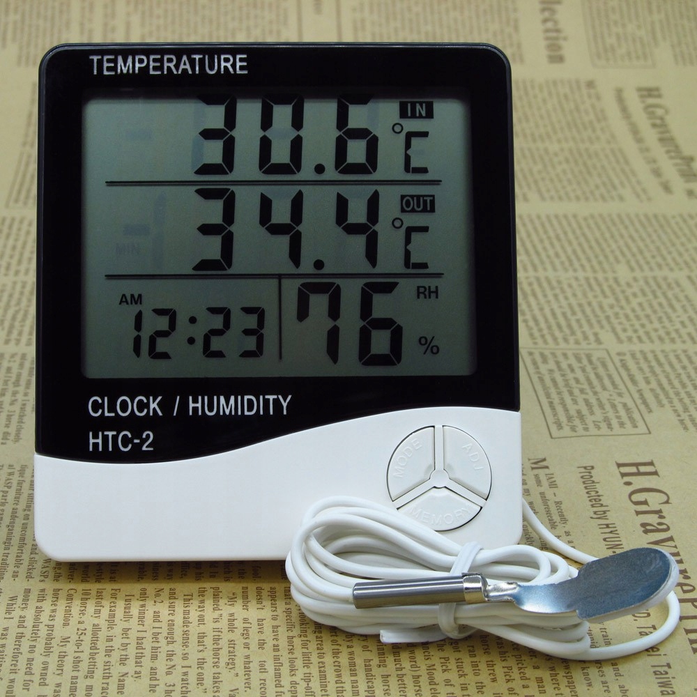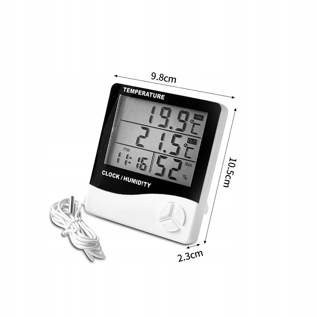 Термометр оснащен большим четким ЖК-дисплеем, на котором отображается температура в помещении и внутри, процент влажности и время. Благодаря этому метеостанция не только удобна в использовании, но и интуитивно понятна. Компактные размеры устройства 10 см х 9 см х 2 см позволяют разместить его в малозаметном месте. Кроме того, устройство оснащено подставкой, которую можно разместить на столешнице, столе или письменном столе, а также держателем, который можно повесить на стену.