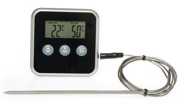 Этот цифровой термометр с датчиком температуры мяса, таймером и звуковым сигналом проинформирует вас о степени готовности или степени готовности ваших блюд. Легко чистится, оснащен функцией часов. Таймер обратного отсчета до 99 минут. Температура макс. 250°С