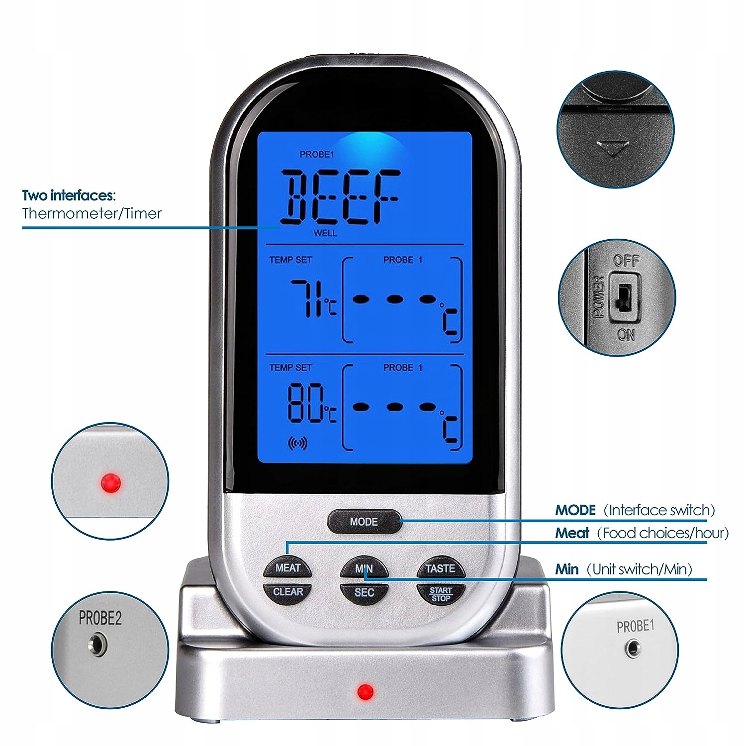 TERMOMETR KUCHENNY BEZPRZEWODOWY DO MIĘS LCD SONDA