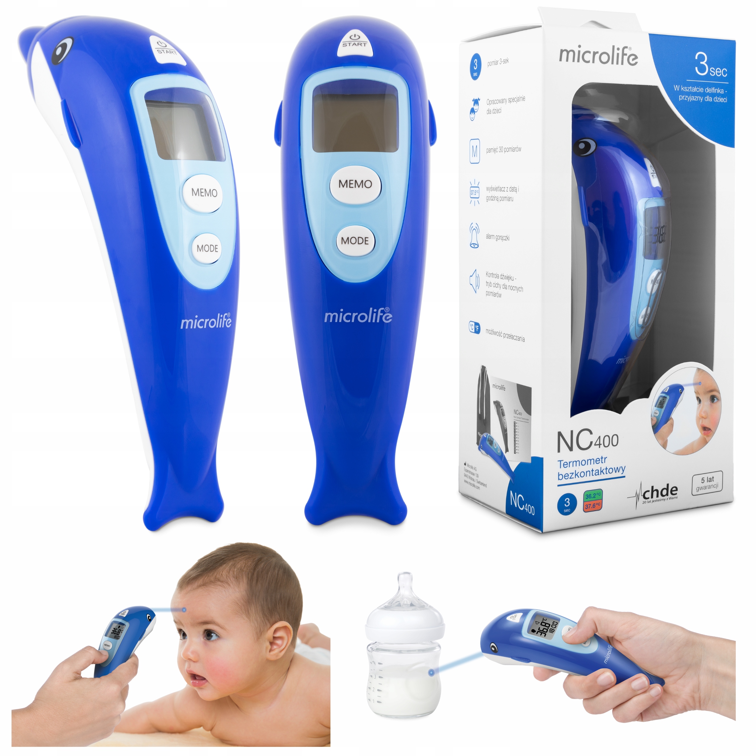 Новый бесконтактный термометр Microlife NC 400, помимо своей надежности, точности и простоты в эксплуатации, позволяет деликатно и неинвазивно измерять температуру тела, не прикасаясь к пациенту. Уникальный дизайн в виде дельфина был специально разработан, чтобы сделать измерения более приятными для детей.