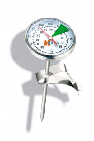 Professional термометр для измерения температуры Foade Milk с полезным зажимом , позволяющим прикрепить его к кувшину . Перегретое молоко становится горьким и может испортить вкус даже лучшего кофе. С другой стороны, использование термометра позволяет достичь оптимального тепла молочной пены и сохранить его натуральную сладость .