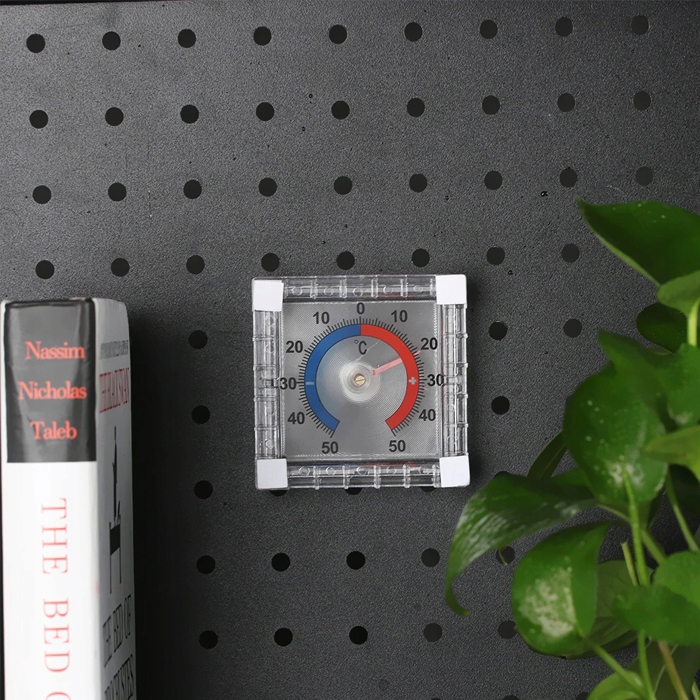 Биметаллический термометр квадратной формы из прозрачного пластика.