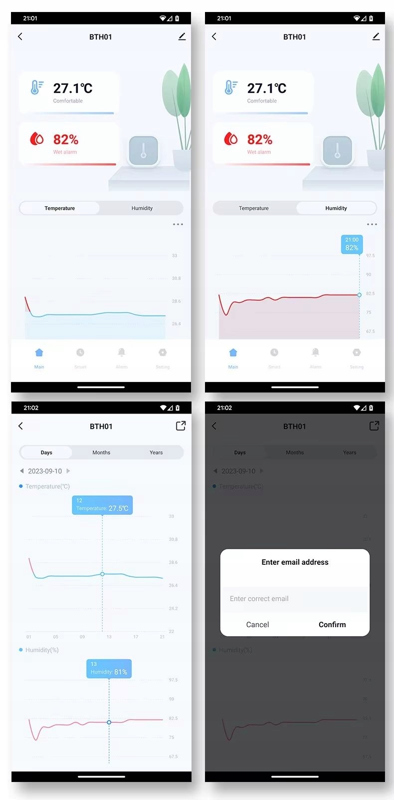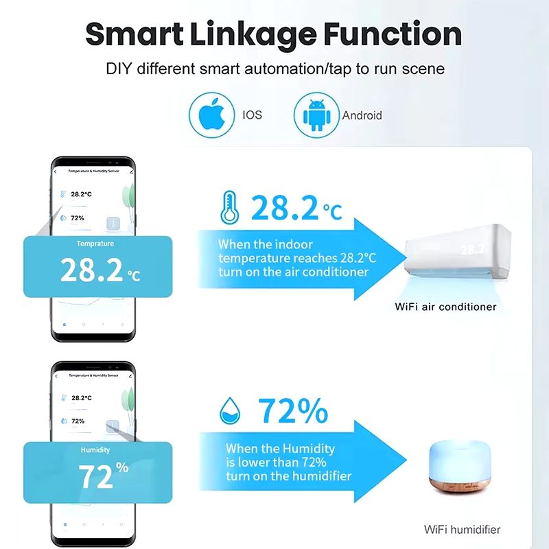 Датчик температуры и влажности контролирует и записывает в реальном времени температура и влажность в вашей комнате. Благодаря доступной tuya smart или Smart Life , вы можете отслеживать текущие и исторические данные. Кроме того, если обнаружены необычные условия окружающей среды, датчик отправит уведомление о тревоге на ваш телефон или выполнит сценарий , который вы определяете - например, он будет включать кондиционер или нагрев через интеллектуальную розетку , эстафета или голова.
