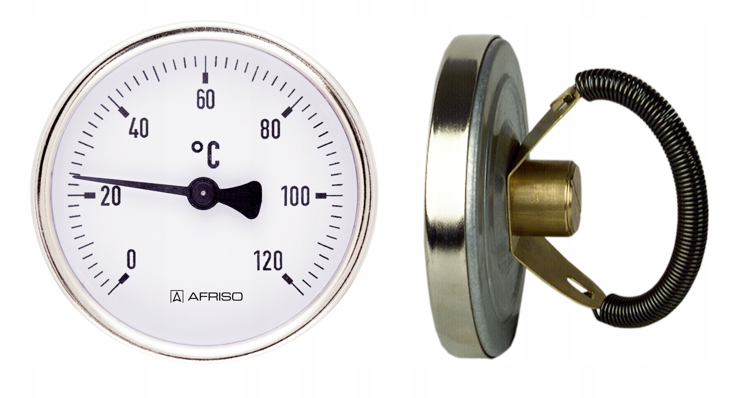 Термометр биметаллический контактный Ath 63 F, fi63 мм, 0÷120°С, для труб 3/8"÷1 1/2", ax, класс 2 АФРИСО