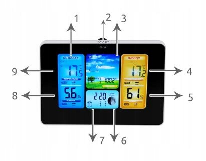 ✅ СПЕЦИФИКАЦИЯ — измерение температуры внутри и снаружи: ДА; измерение влажности внутри и снаружи: ДА; измерение давления воздуха: ДА; индикатор фазы луны: ДА; часы: ДА; отметка даты: ДА; индикатор тенденции изменения погоды: ДА; Диапазон измерения температуры в помещении: -9,9℃~50℃ (15℉~122℉); Диапазон измерения температуры наружного воздуха: -20℃~60℃ (-4℉~140℉); точность измерения: ± 1 ℃; Диапазон измерения влажности (внутри и снаружи): 20% относительной влажности ~ 95% относительной влажности; погрешность измерения влажности: ± 5%; Диапазон измерения атмосферного давления: == 600 гПа/мБ ~ 1100 гПа/мБ (17,72 дюйма рт. ст. ~ 32,48 дюйма рт. ст.); Предел погрешности измерения давления: == ± 5гПа; дальность действия датчика: 60 м; размеры станции (длина/ширина/высота): 17,5/17/13см; размеры датчика (длина/ширина/высота): 5/2,5/9,5 см; длина кабеля: 150 см; блок питания станции: 2х АА (в комплект не входят); питание датчика: 2x AA (в комплект не входят); вес набора: 330 г; вес с упаковкой: 420г.