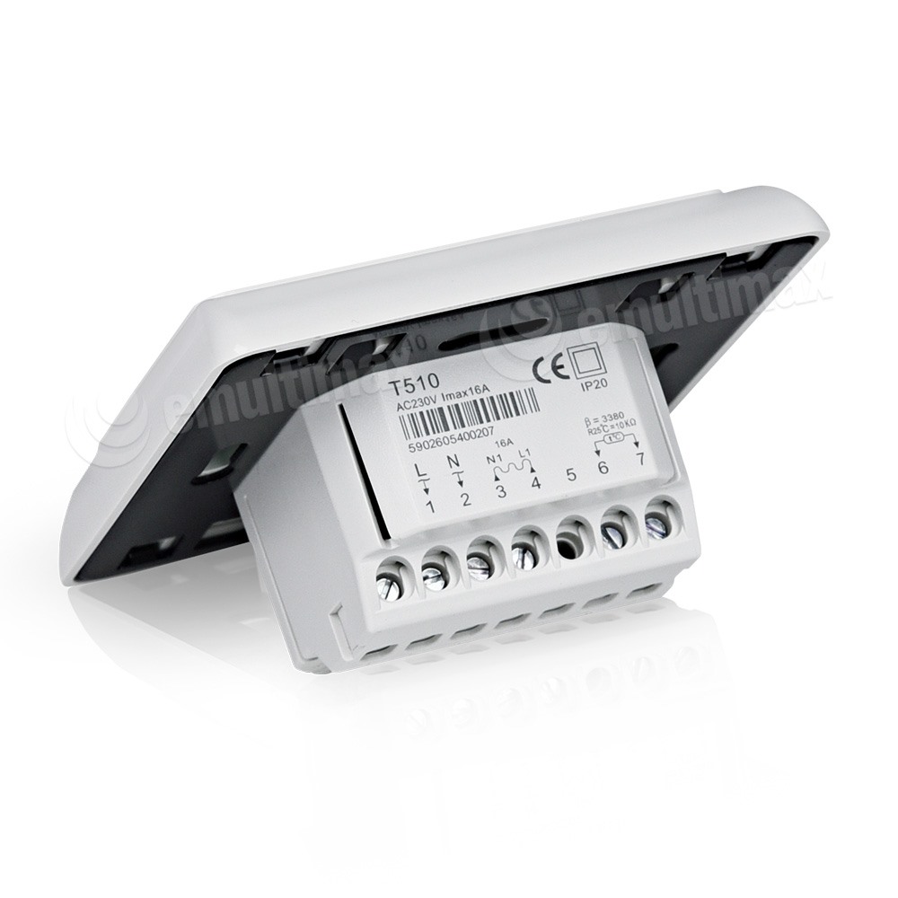 T510 оснащен двумя датчиками температуры. Встроенный и напольный приточный, который подключается кабелем длиной 3 метра и размещается в полу с подогревом – используется для ограничения температуры пола до определенного заданного значения.