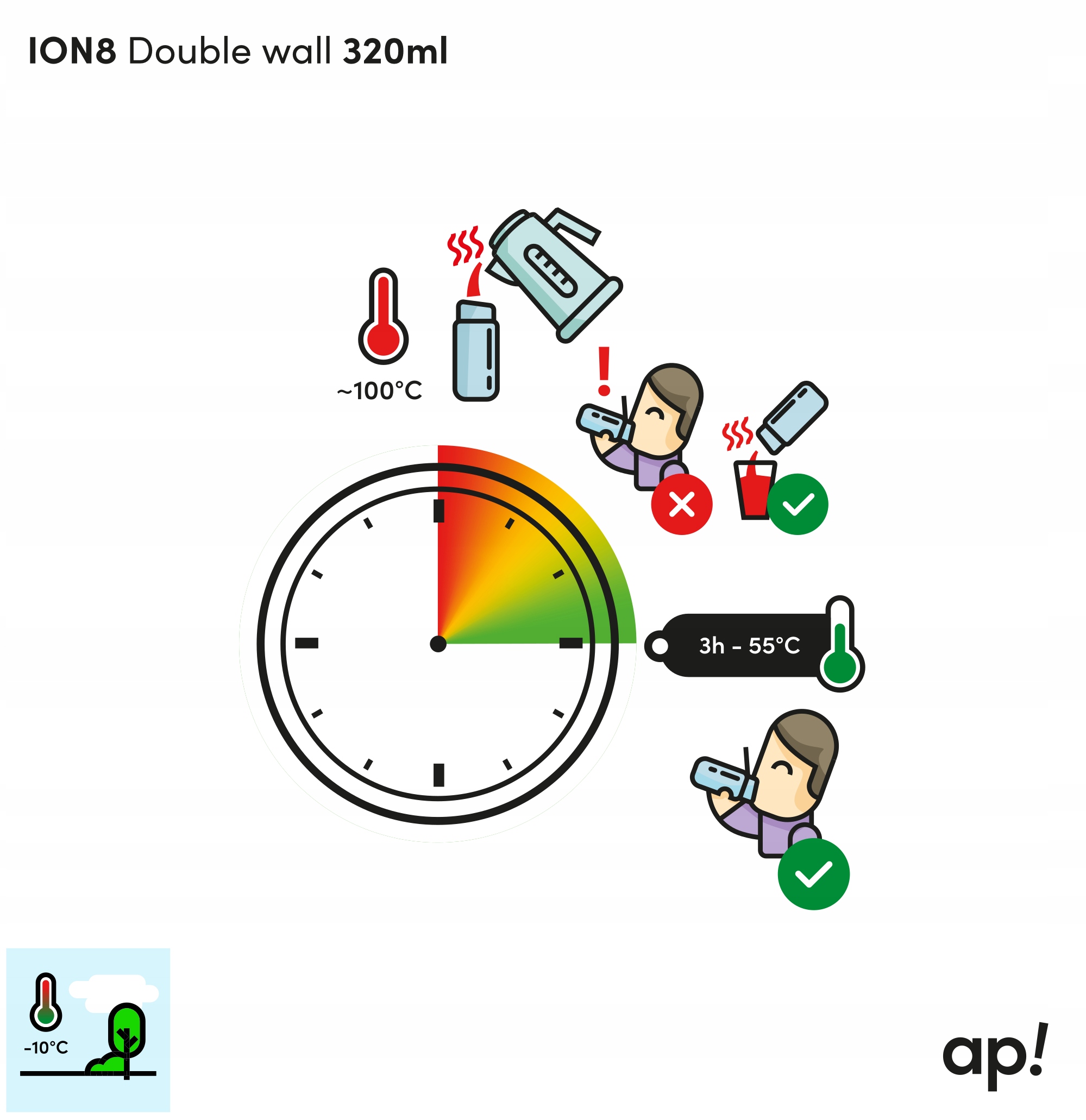 После заливки в бутыль 320 мл кипятка, при температуре окружающей среды -10°C (зимние условия) вода достигает температуры 55°C через 3 часа