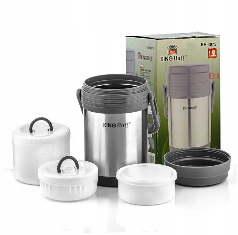 Обеденный термос объемом 1,5 литра от KINGHOFF, изготовлен из нержавеющей стали и АБС-пластика. Изделие предназначено для хранения пищевых продуктов (как горячих, так и холодных). Внутри находятся 3 герметичных контейнера для индивидуальной посуды общей вместимостью ок. 1,5 л.