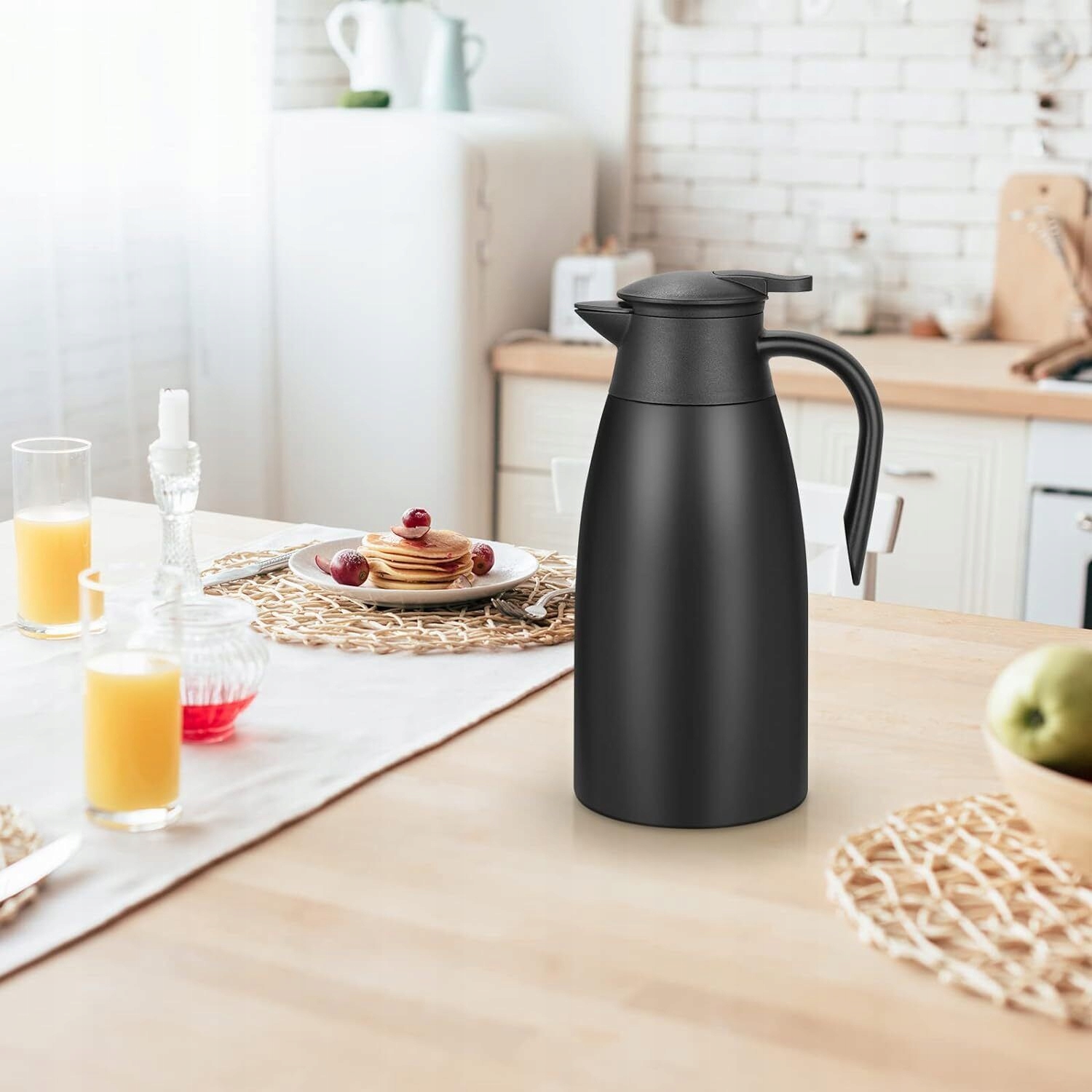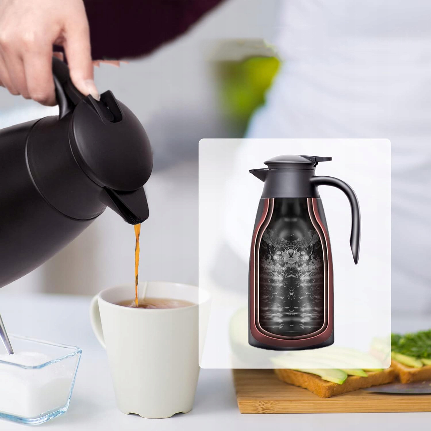 Изготовлен из съемной крышки, не содержащей BPA, и прочной нержавеющей стали 18/8 внутри и снаружи. Наш графин для кофе емкостью 2000 мл можно использовать в качестве термоса для чая/кофе, графина для молока, графина для сливок, сока, вина, кувшина для горячей воды.