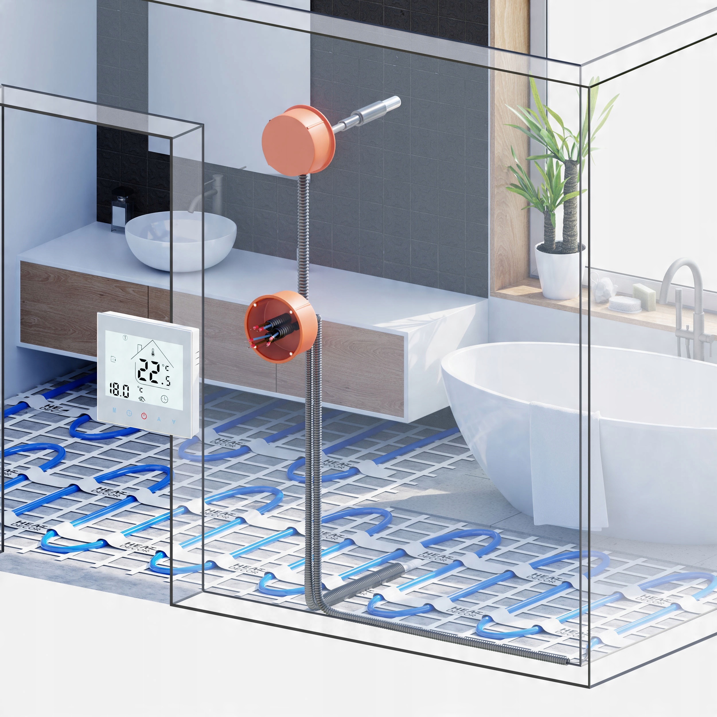 Термостат контролирует температуру в помещении и при этом может располагаться за пределами контролируемого помещения. Поддерживает два внешних датчика температуры: пола и воздуха. Это значит, что вы можете безопасно контролировать температуру в ванной и разрешить установку в одном месте термостатов для всех комнат, что освобождает ценное пространство на стене.