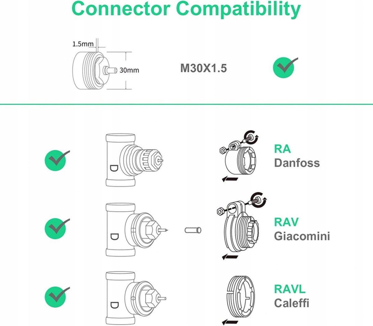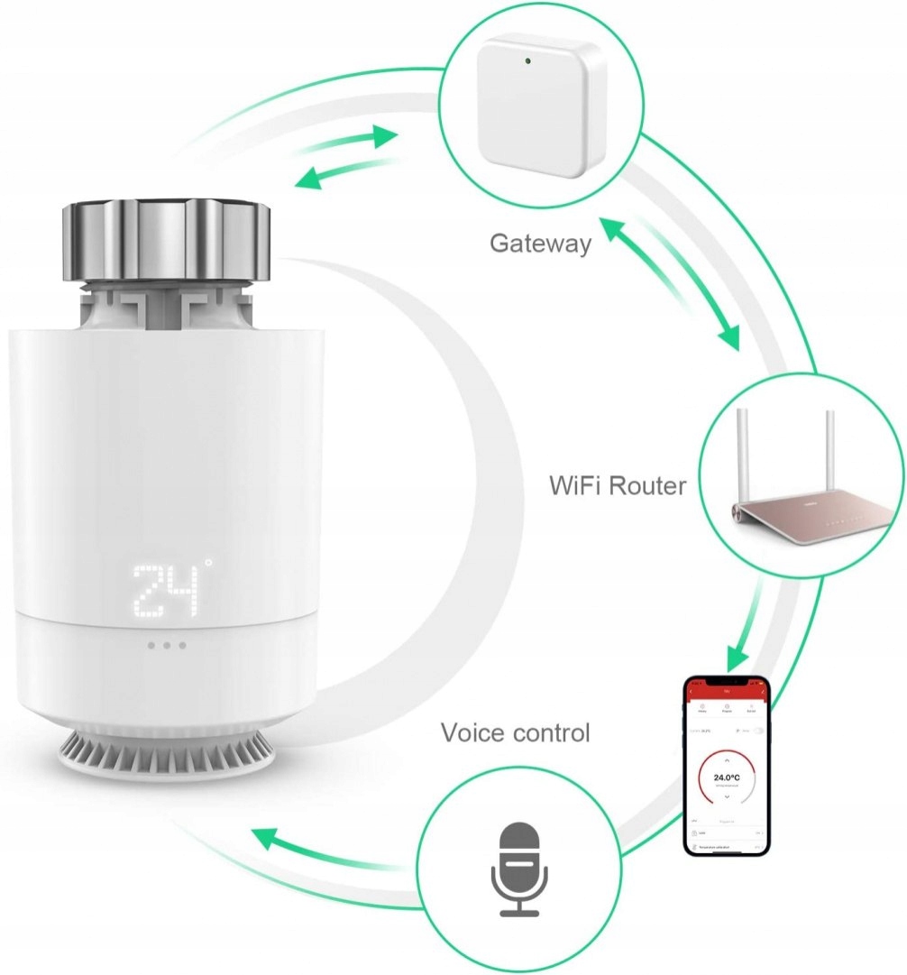 Голосовое управление — устройство совместимо с Amazon Alexa, Echo Dot, Google Assistant. Могут распознаваться голосовые команды, такие как «Alexa, включи термостат», «Alexa, установи температуру термостата радиатора на 26 ℃». Для этой функции требуется шлюз.