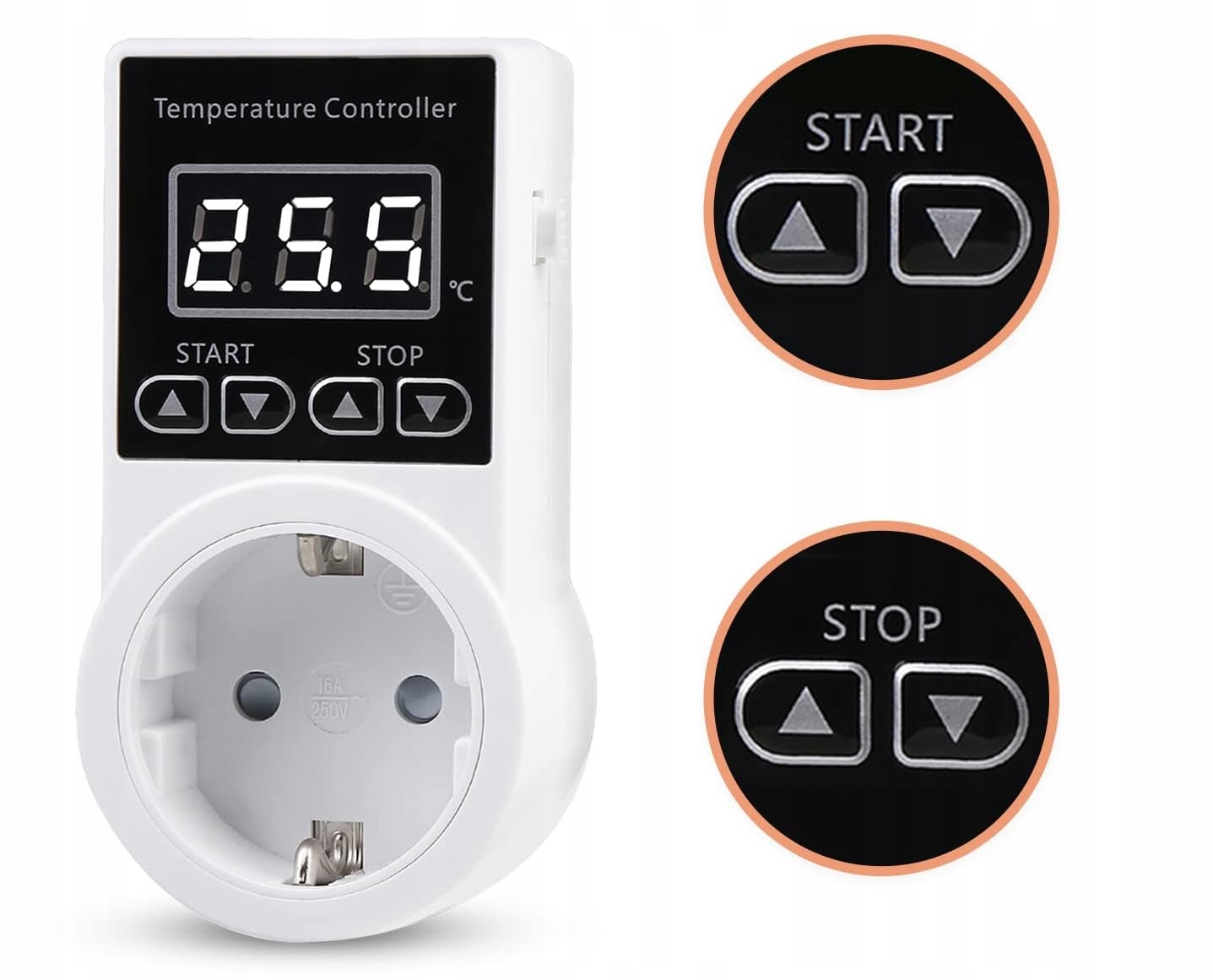 Диапазон контроля температуры: от -40 ℃ до 120 ℃. Точность контроля температуры: ± 1%. Гнездо регулятора температуры может автоматически переключаться между режимами нагрева и охлаждения. Выключатель термостата на выходе поставляется с кабельным датчиком температуры, который можно подключить там, где требуется измерение температуры.