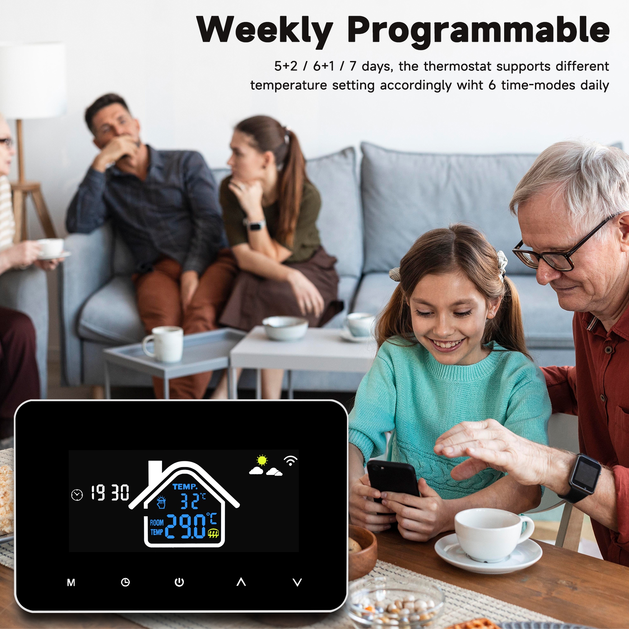 【Управление через приложение】 Умный термостат, вы можете управлять им с помощью телефона, прежде чем вернуться домой. (ПРИЛОЖЕНИЕ: Умная жизнь)