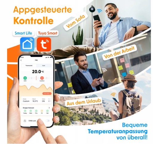 С помощью Smart Life и приложения Tuya Smart вы можете легко управлять контроллером отопления KESSER с дивана, в офисе или во время путешествия. Установите температуру с точностью до 0,5 °C и наслаждайтесь гибкостью, необходимой для вашей современной жизни, с полным контролем непосредственно со своего смартфона.