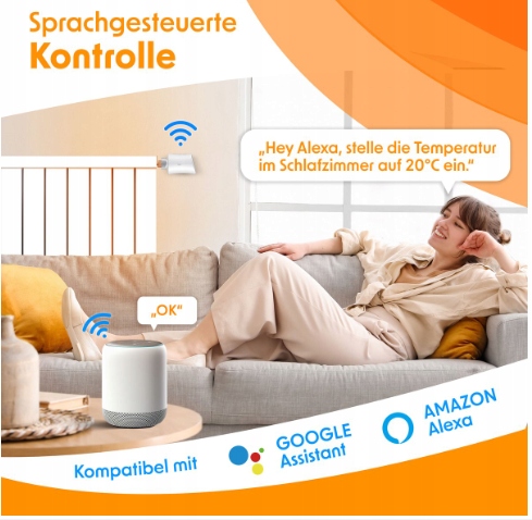 Контроллер отопления KESSER совместим с Google Assistant и Amazon Alexa, что позволяет управлять температурой с помощью голосовых команд. Просто скажите: «Привет, Алекса, установи температуру в своей спальне на 20 °C», и ты мгновенно получишь идеальную комфортную температуру.