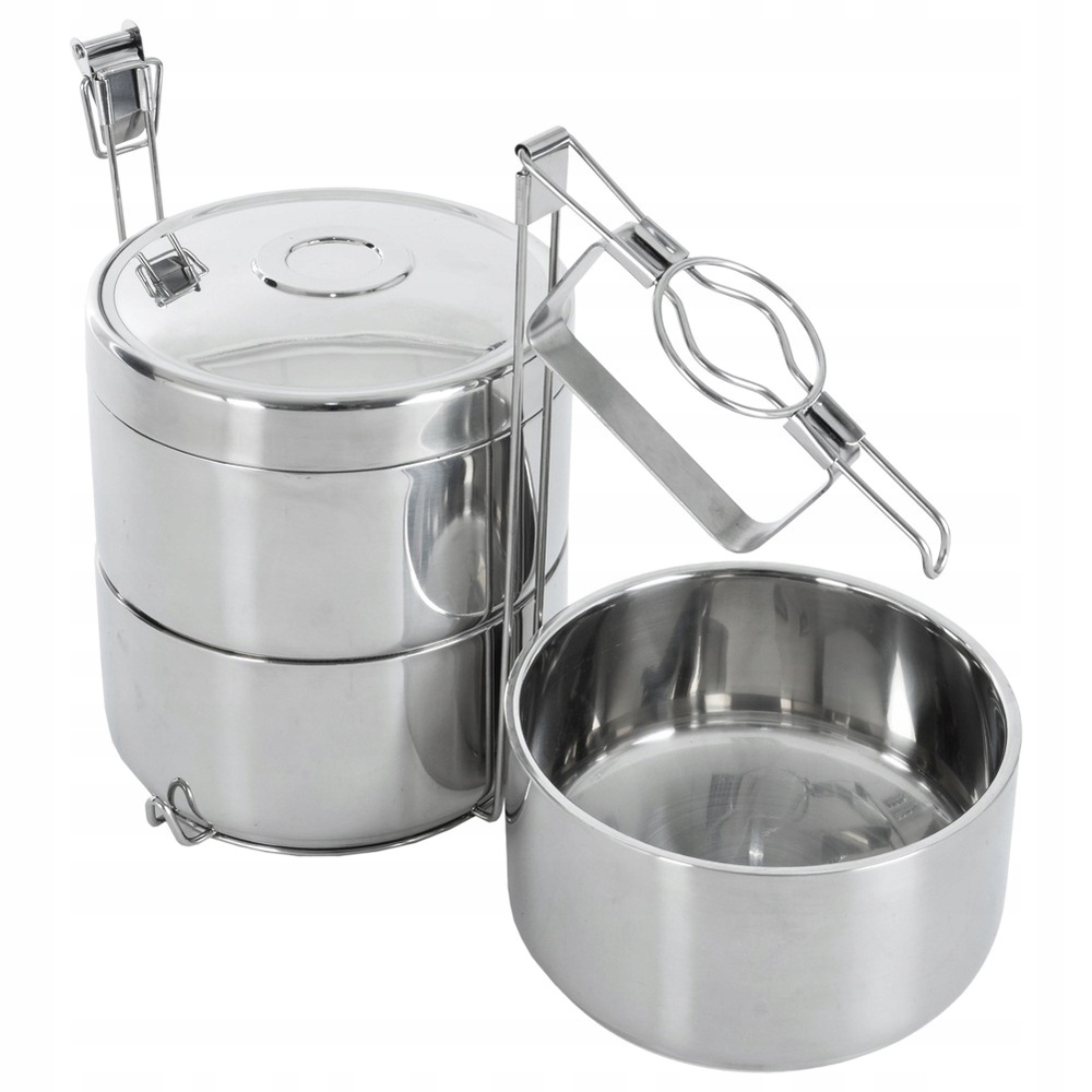 Термальная столовая для переноски продуктов питания. В комплект входят 3 контейнера, крышка и рамка с ручкой. Изготовлен из нержавеющей стали высочайшего качества. Каждый контейнер имеет емкость 900 мл.