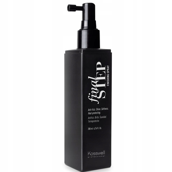 Завершающий спрей Kosswell Final Step для укладки всех типов волос. Косметическое средство, дающее эффект ламинирования волос. Его эксклюзивная формула улучшает структуру волос, обеспечивая мягкость и исключительный блеск. Кроме того, он предотвращает спутывание волос и облегчает их укладку. Обеспечивает термозащиту от высоких температур от выпрямителя, фена или щипцов для завивки. Средство с инновационным термопротектором, создающим защитный слой, делающим волосы более мягкими, блестящими и обеспечивающим эффект ламинирования.