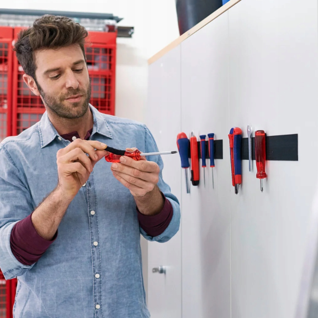 Просто наклейте ремешок этой универсальной ленты к домашней работе на стене, лестнице или любой другой плоской поверхности. Вставьте вторую часть на инструмент или устройство и готово: интеллектуальное решение, которое позволяет прикреплять инструменты таким образом, чтобы они были под рукой, когда они нужны.