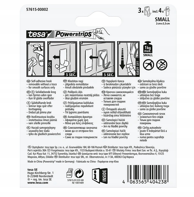 - Монтаж без инструментов: быстрая и простая установка с помощью полосок tesa® Powerstrips - грузоподъемность одного крючка до 1 шт. кг