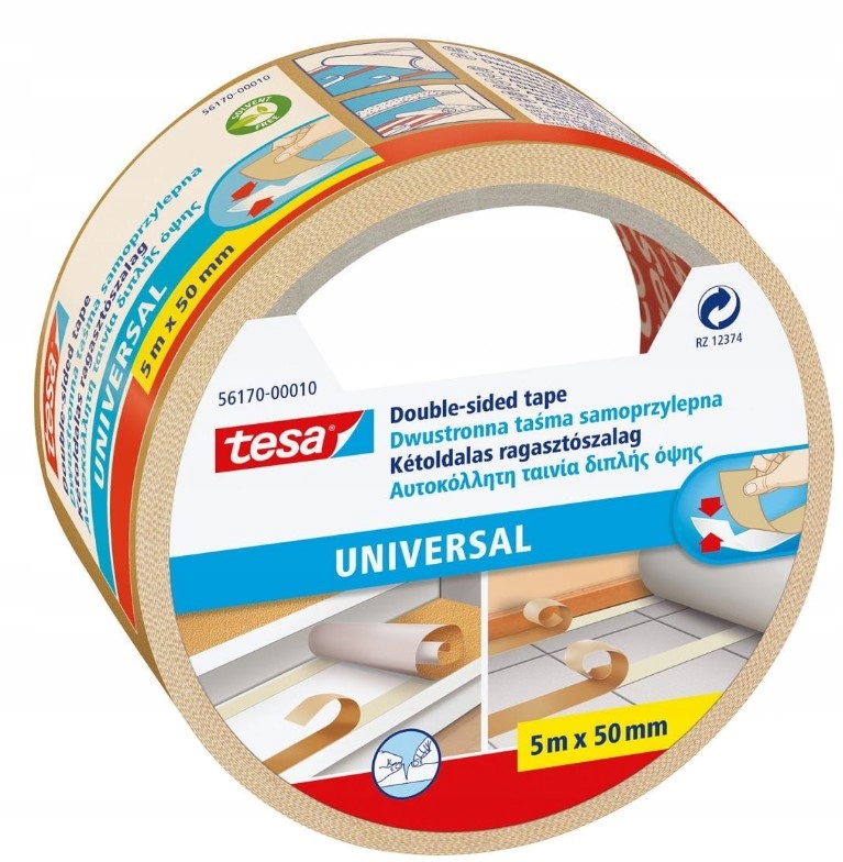 Универсальный самоклеящийся двусторонний скотч tesa® Universal, идеально подходящий для крепления ковров, поделок, поделок и внутренней отделки. Подходит для всех типов материалов при условии, что они имеют достаточно твердую, ровную и гладкую поверхность.