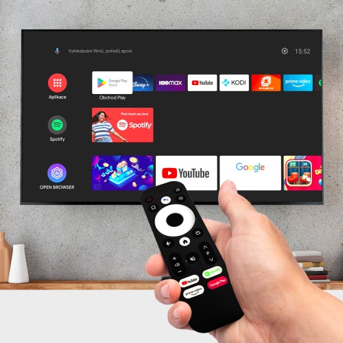 Пульт дистанционного управления оснащен встроенным микрофоном. Нажмите цветную кнопку, чтобы включить микрофон. Произнесенная команда затем за считанные секунды транскрибируется в текст. Таким образом, вы можете искать такие вещи, как прогноз погоды, видео в приложении YouTube и приложение в Google Play.