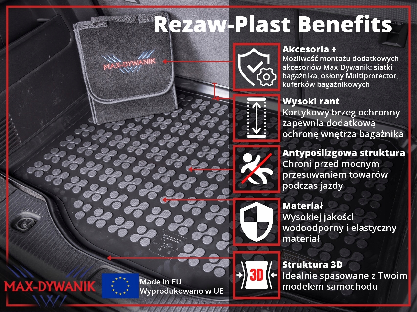Дополнительным преимуществом предлагаемого коврика является его уникальная гибкость, благодаря которой во время использования у нас остается доступ к пространству под багажником (возможность поднять полку для доступа к отсекам для хранения вещей). или запасное колесо) или вытащить коврик из багажника, чтобы почистить его.