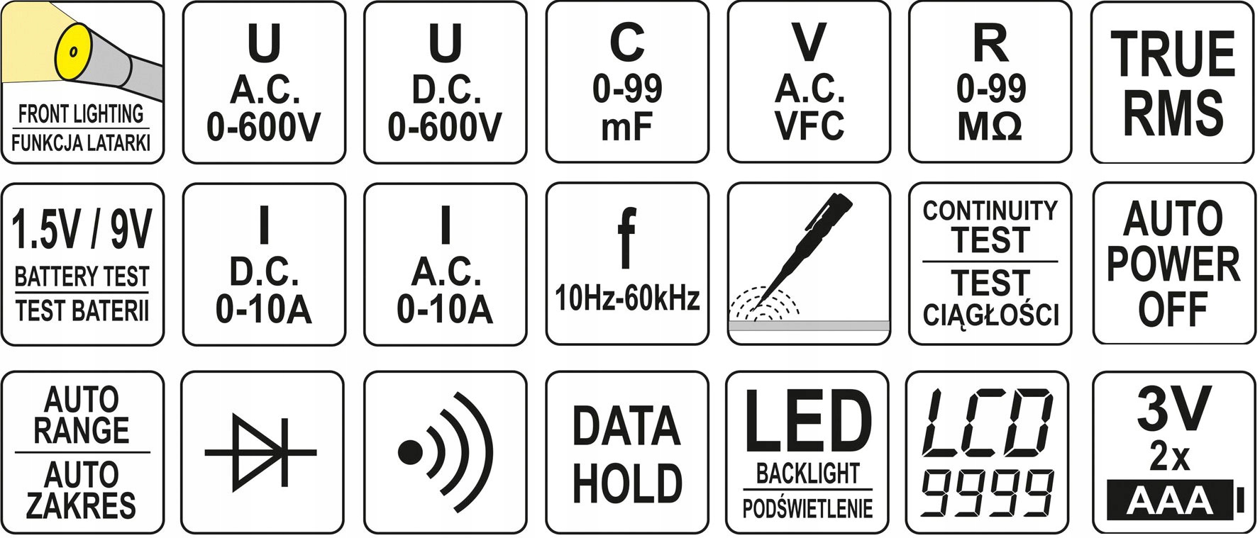 - измерение емкости: C 0–99,99 мФ (автоматический диапазон)