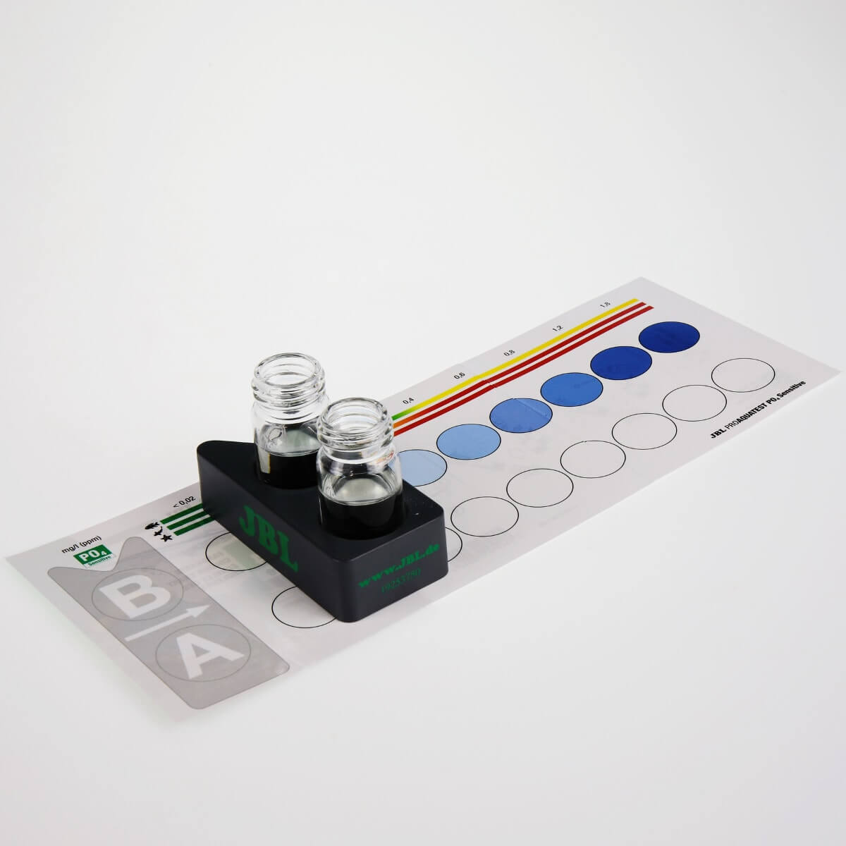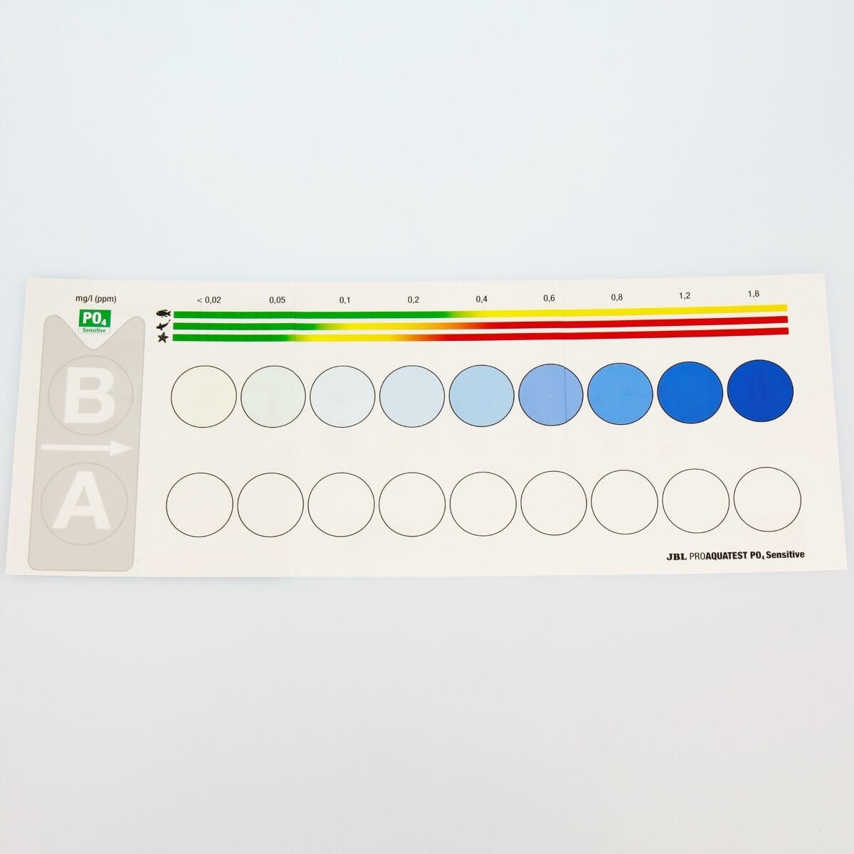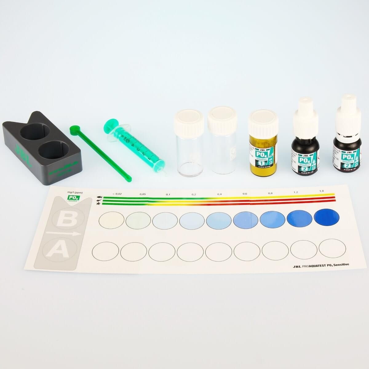 В комплект JBL ProAquaTest PO4 Sensitive входят: реагенты, прозрачная цветовая шкала, шприц, 2 пробирки с крышками, дозатор, держатель для пробирок и Инструкция по измерению. Всего несколько простых шагов, и вы сможете в короткие сроки считать результат теста по цветовой шкале. Тест позволяет определить концентрацию фосфатов в диапазоне от <0,02 до 1,8 мг/л.
