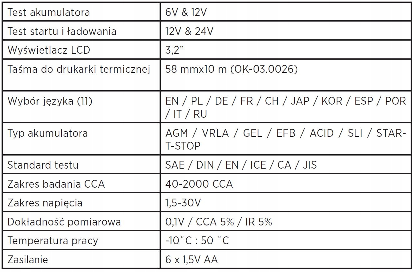 Тестер предназначен для кислотных батарей, геля, AGM, EFB, CA и Start Stop . Он имеет цифровой, разборчивый индикатор с информацией о состоянии батареи, сильных крокодиловых зажимах и автоматическом управлении , благодаря тому времени и загрузке во время теста батареи будет отображаться автоматически. Тестер имеет возможность выбрать столько языков, которые 7, включая польский язык . Как для отображения, так и для распечатки после тестирования. интегрированный принтер с тестером печатает результат теста, что является доказательством для пользователя автомобиля.